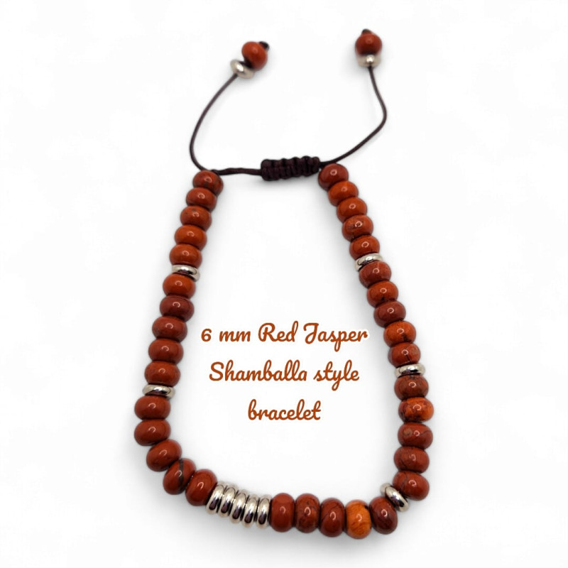 This 6 mm Red Jasper Shamballa-style bracelet combines earthy charm with powerful symbolism.