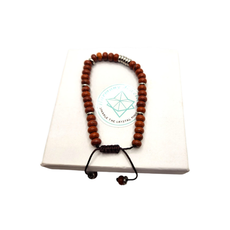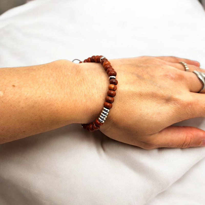 Featuring deep, brick-red beads, each stone represents strength, grounding, and resilience.