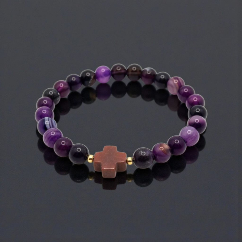 The Crown of Faith Bracelet symbolizes steadfast strength and divine peace united through faith. Made with soothing 8 mm Purple Lace Agate—a stone of calmness, clarity, and spiritual connection—this bracelet is anchored by a bold Red Jasper Cross, representing courage, endurance, and the power of Christ’s love.
