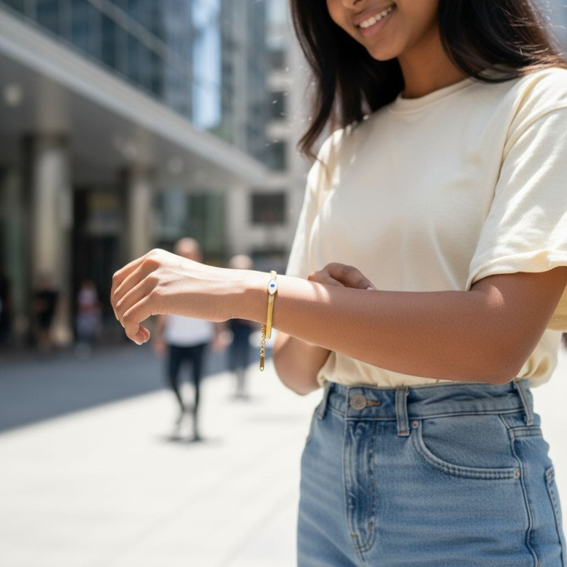 The Divine Protection Bracelet blends faith, elegance, and timeless style. Crafted from lustrous gold stainless steel in a sleek 3 mm herringbone chain, it features three radiant blue Divine Eye charms — a symbol of spiritual protection and inner peace. The adjustable lobster clasp ensures a perfect fit, making it both meaningful and effortlessly chic. Designed to remind you that you are always guided, watched over, and surrounded by divine light.