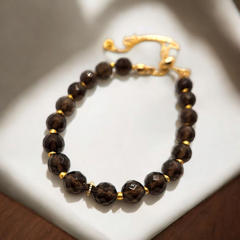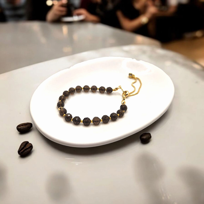 The Espresso Glow Bracelet features 6 mm faceted Smokey Quartz, reflecting the rich warmth of freshly brewed coffee, elegantly finished with a gold-tone slide adjustable clasp for a timeless and sophisticated look.