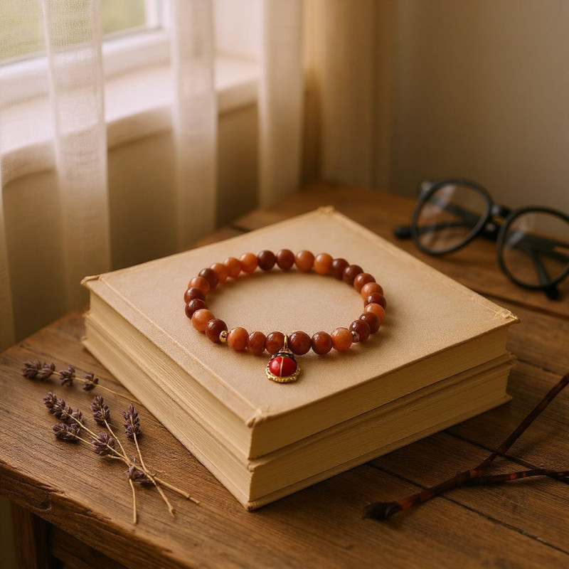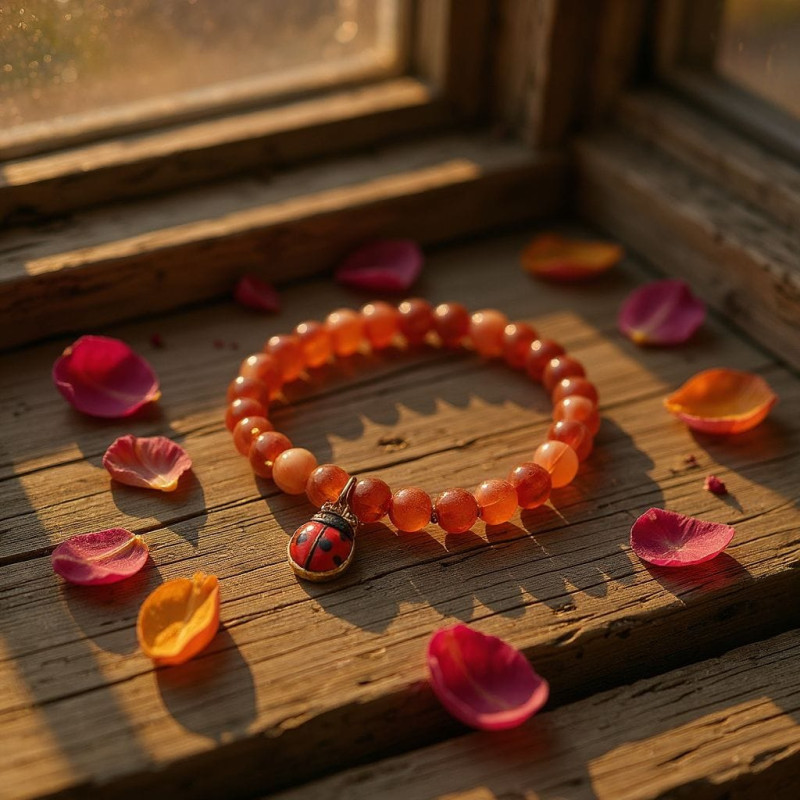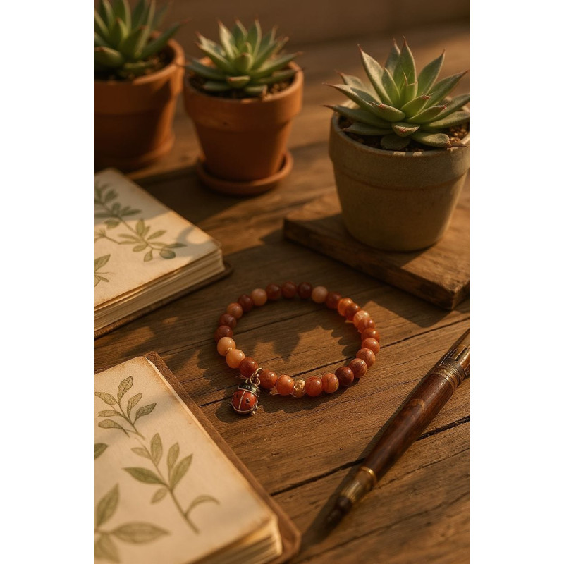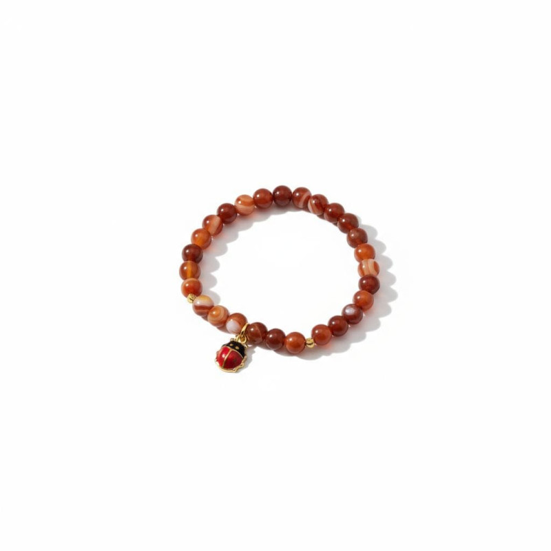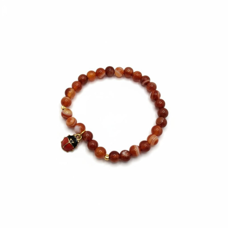 Design: Vibrant Carnelian with two golden beads and a symbolic Ladybug charm