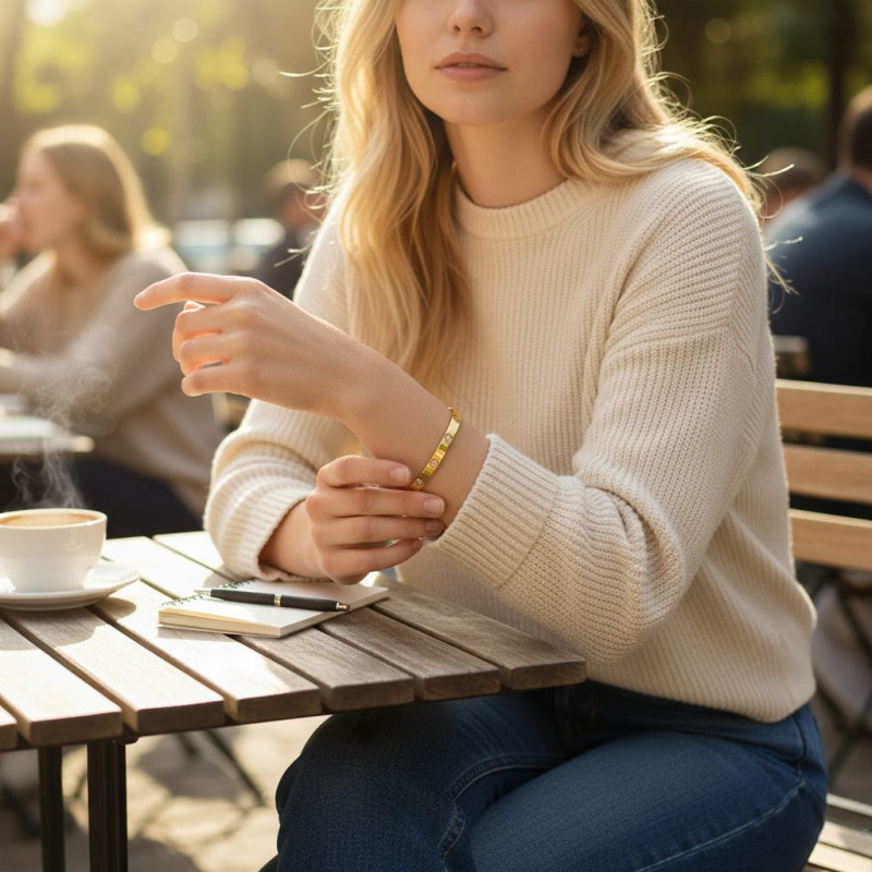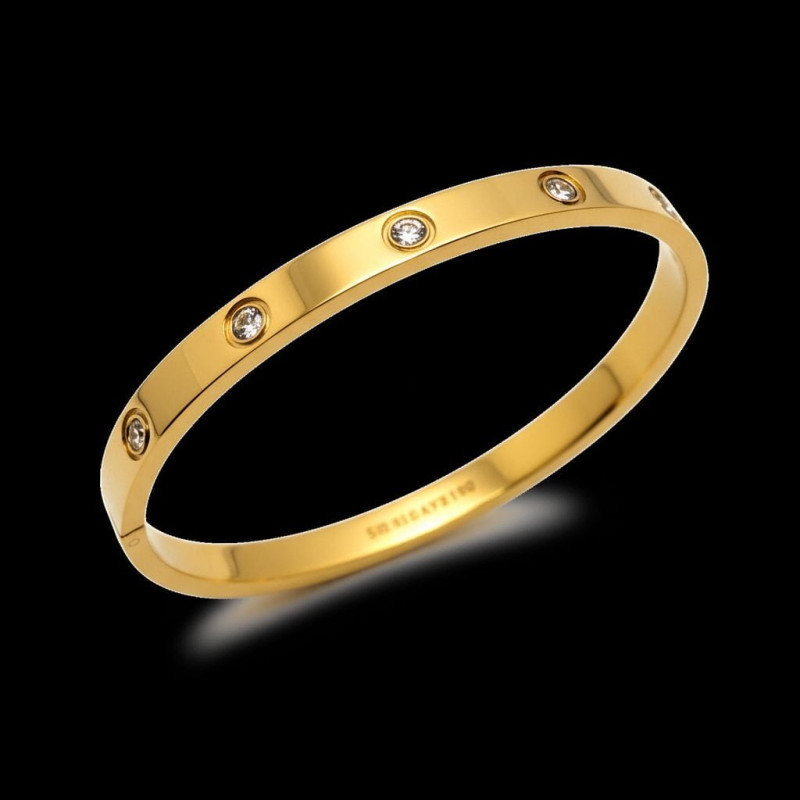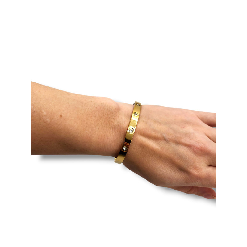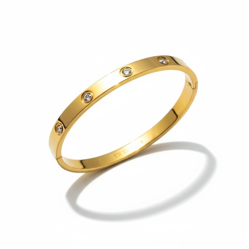The Golden Halo Bangle captures the essence of refined elegance and radiant simplicity. Crafted from lustrous gold stainless steel, it features five sparkling zirconia stones set in delicate circular frames — each one reflecting light like a halo of grace. With its smooth 5 mm width and comfortable 18 cm fit, this timeless piece elevates any look, adding a soft golden glow that complements both everyday wear and special occasions.