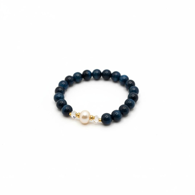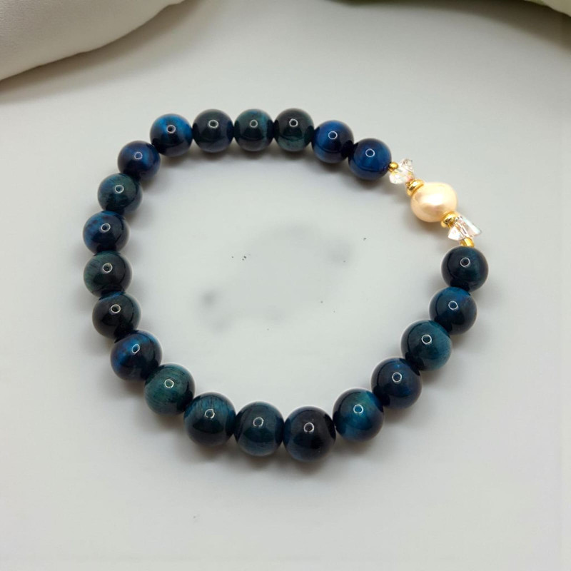 Design: Centerpiece pearl and crystals with golden accent, surrounded by protective Blue Tiger Eye beads