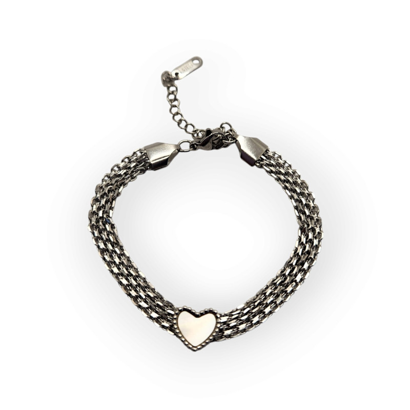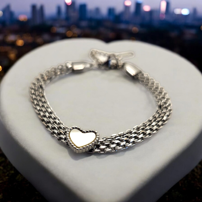 The Heart of the City Bracelet features a delicate silver stainless steel chain with an adjustable lobster clasp, accented by a radiant white Mother of Pearl heart charm, blending timeless elegance with modern versatility.