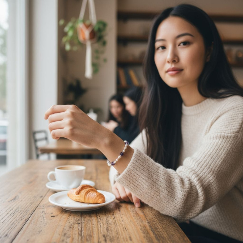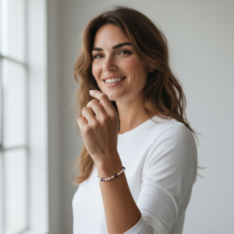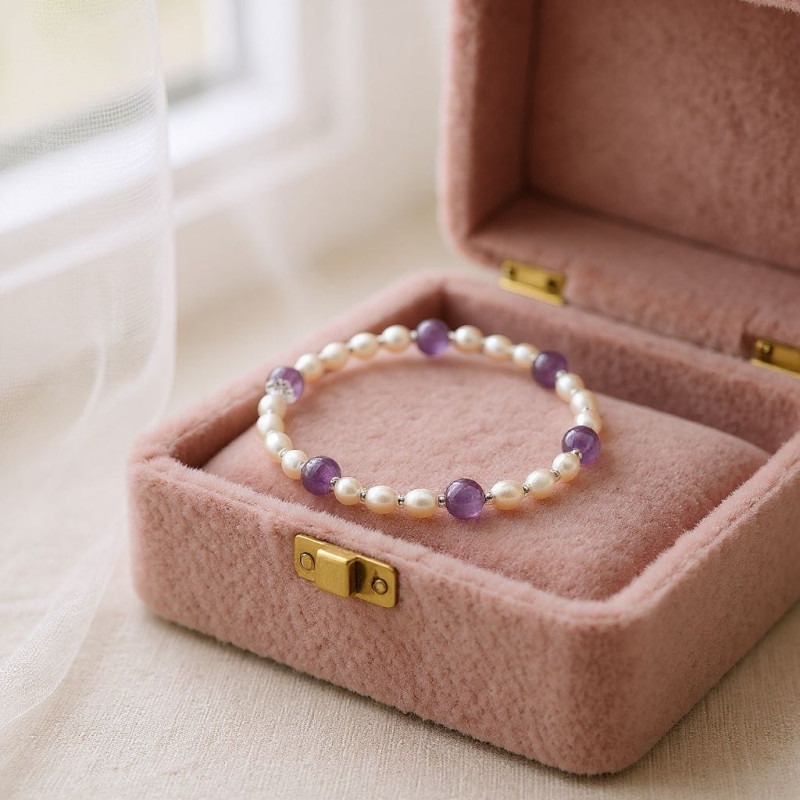 Design: Handcrafted stretch bracelet combining dainty Pearls and round Amethyst beads