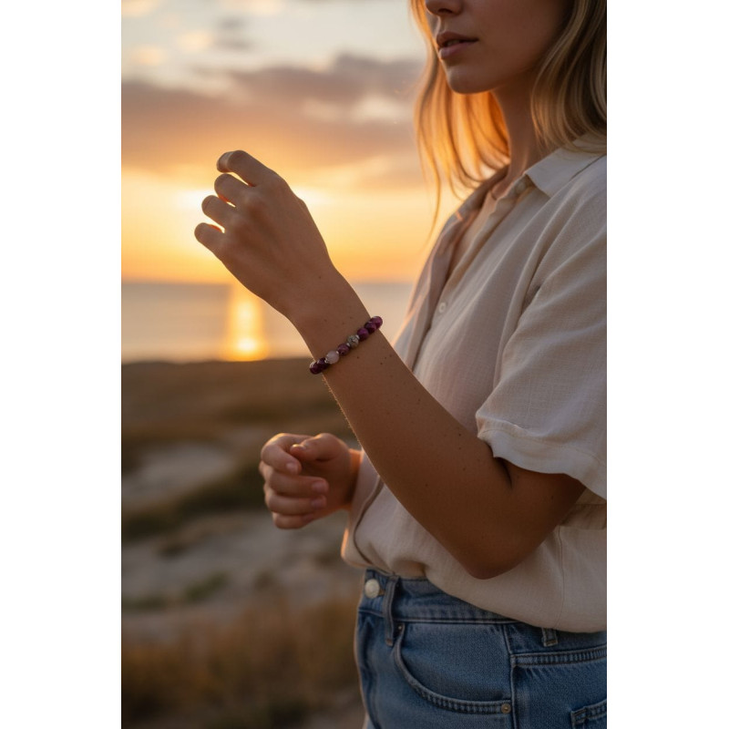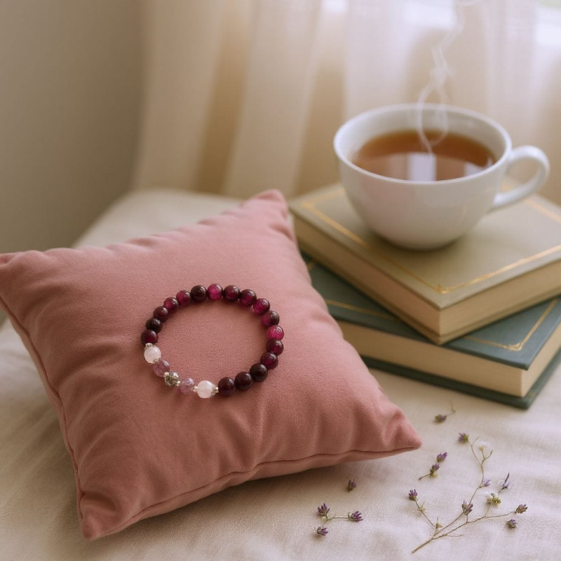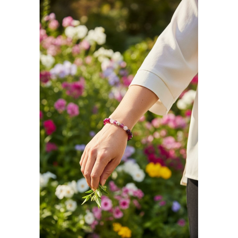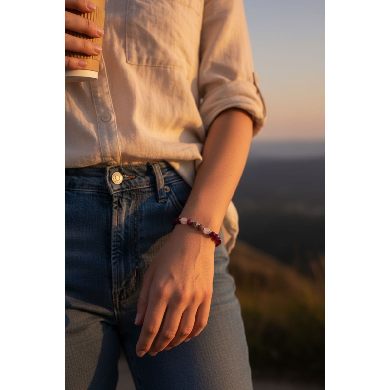 The Joyful Heart Bracelet is a radiant expression of faith, love, and spiritual renewal. Handcrafted with 8 mm Pink Tiger Eye stones, it reflects divine confidence and calm strength — the beauty of a heart rooted in God’s love. In the center, two Rose Quartz and two faceted Strawberry Quartz beads bring warmth and tenderness, symbolizing compassion, forgiveness, and emotional healing. The Murano-style glass bead glimmers with light, representing the joy that comes from walking closely with the Lord.