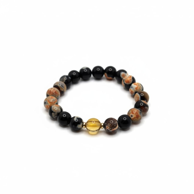 The Light of Grace Bracelet shines with the beauty of 10 mm natural Spotted Agate stones, each bead displaying a divine mix of orange, off-white, brown, and black tones — like the ever-changing hues of creation shaped by God’s hand. In the centre, a yellow Murano-style glass bead glows like a gentle ray of sunlight, framed by two golden accent spacers, symbolizing divine light breaking through the shadows.