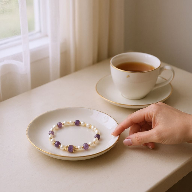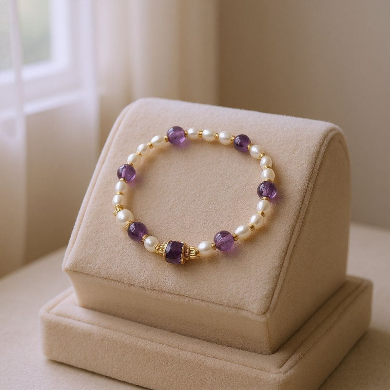 Design: Alternating Amethyst and Pearls for a balanced, radiant look