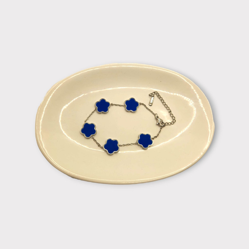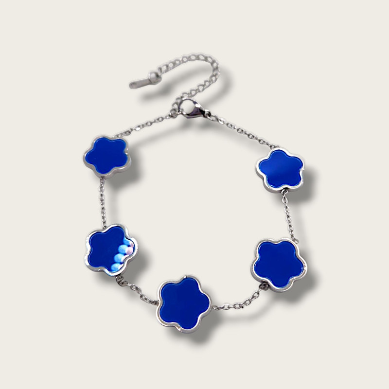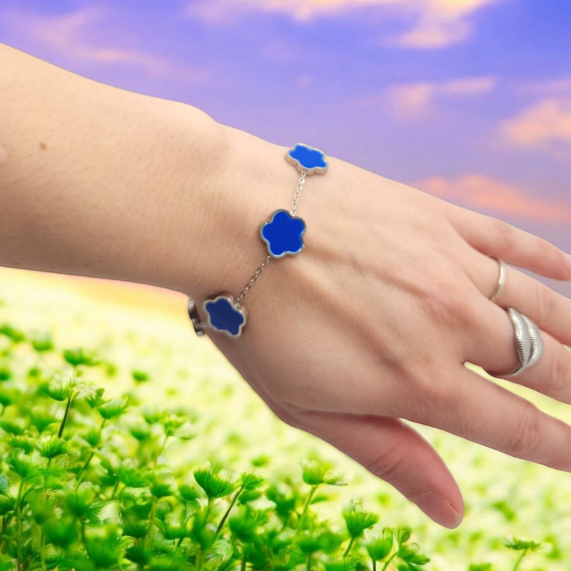 The Silver Sky Clover Bracelet features five delicate blue clover charms set on a sleek silver-tone stainless steel chain, symbolizing luck, serenity, and timeless elegance.