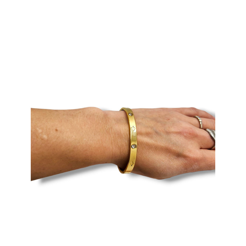 The Starlight Glow Bangle captures the magic of the night sky in a sleek, golden form. Crafted from polished gold stainless steel, its elegant design features a radiant pattern of engraved stars and shimmering zirconia stones set in circular frames. The balance of sparkle and shine creates a look that’s both timeless and contemporary — perfect for those who love refined elegance with a hint of celestial charm.