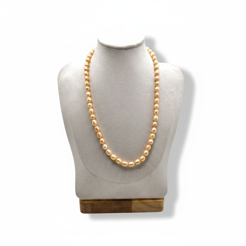 The Dawn Whisper Pearl Necklace captures the tender glow of early morning light. Hand-strung with luminous 7 × 3 mm peach rice-shaped Freshwater Pearls, this delicate necklace radiates warmth and serenity. Each elongated pearl shimmers softly, symbolizing purity, renewal, and the gentle strength that begins each new day. Finished with a sleek silver-tone clasp, this timeless design adds an elegant touch to both everyday grace and special moments.