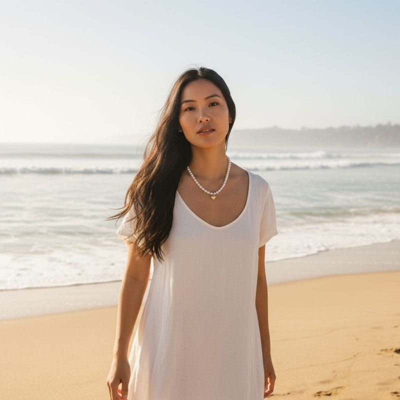 The Heavenly Heart Pearl Necklace embodies purity, tenderness, and divine love. Handcrafted with luminous 5–6 mm rice-shaped Freshwater Pearls, this elegant piece features a radiant Gold Stainless Steel heart charm — a gentle reminder that love is the essence of faith and grace. Its dainty 15-inch design with a 2-inch extender makes it a versatile and feminine piece, perfect for layering or wearing on its own. A timeless expression of beauty and devotion, this necklace glows with a heavenly light that complements every soul it adorns.