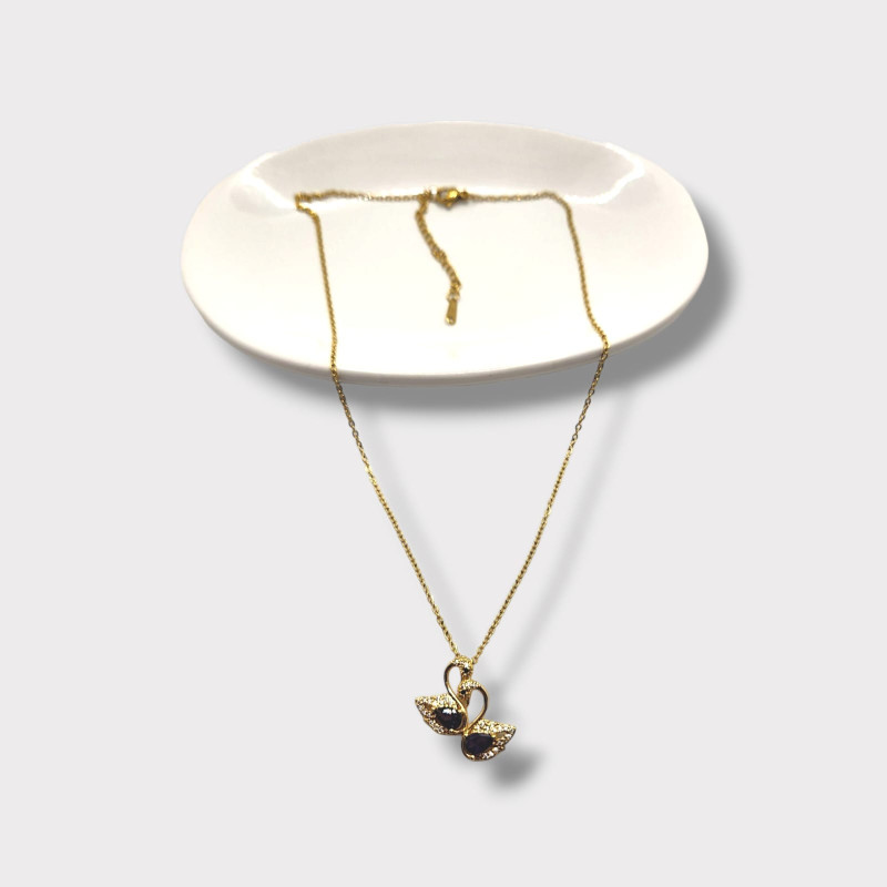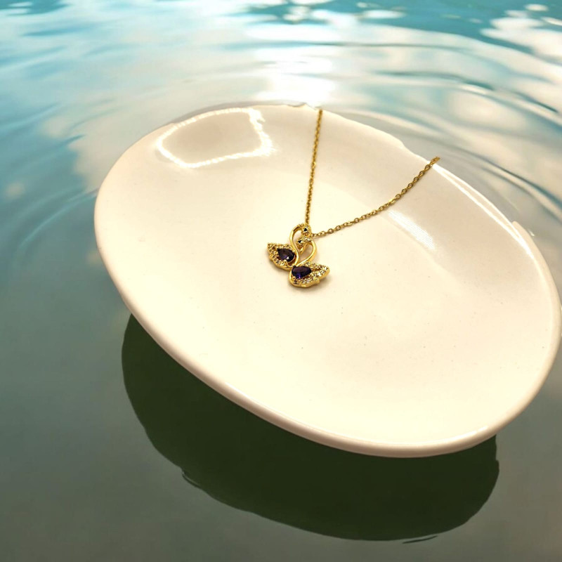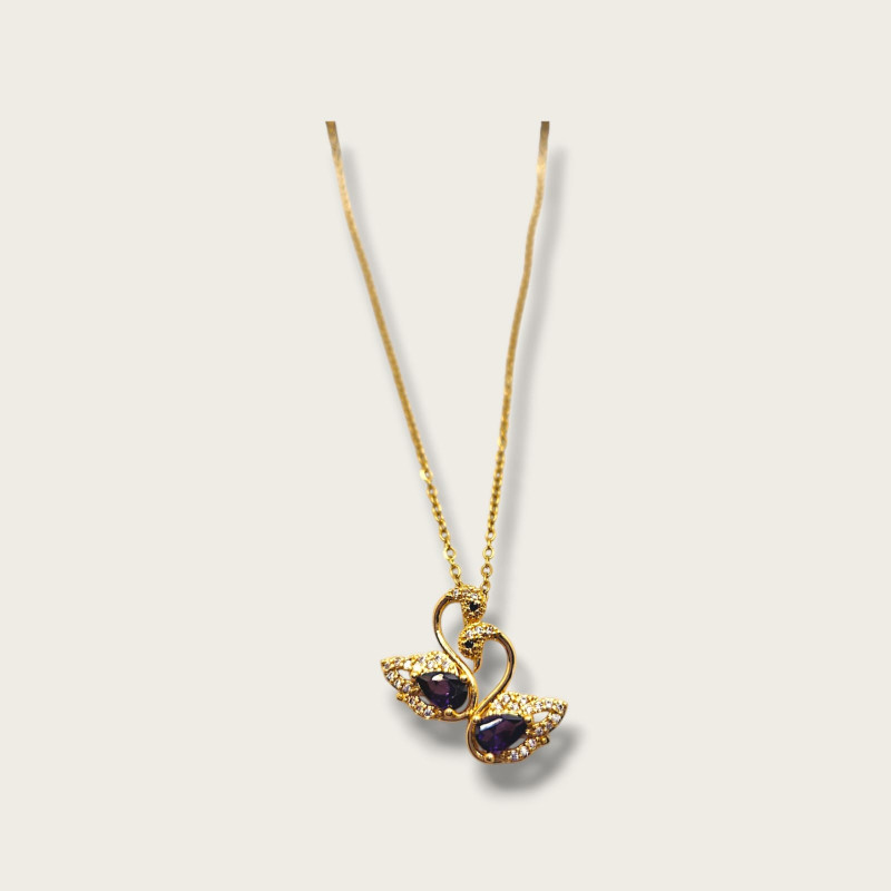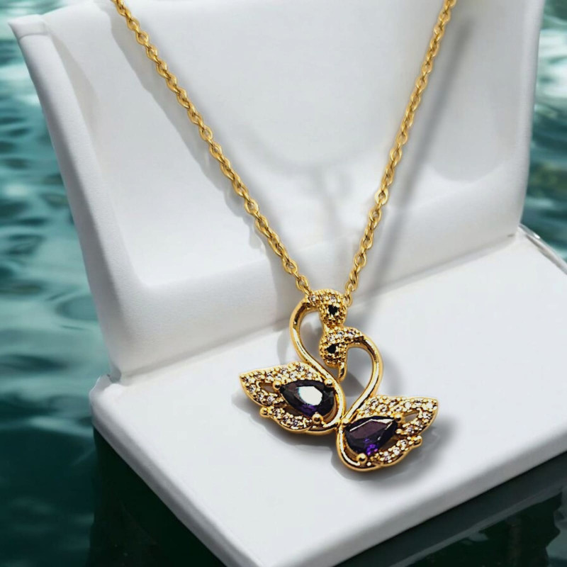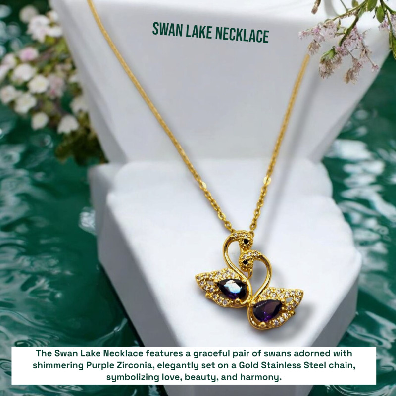 The Swan Lake Necklace features a graceful pair of swans adorned with shimmering Purple Zirconia, elegantly set on a Gold Stainless Steel chain, symbolizing love, beauty, and harmony.