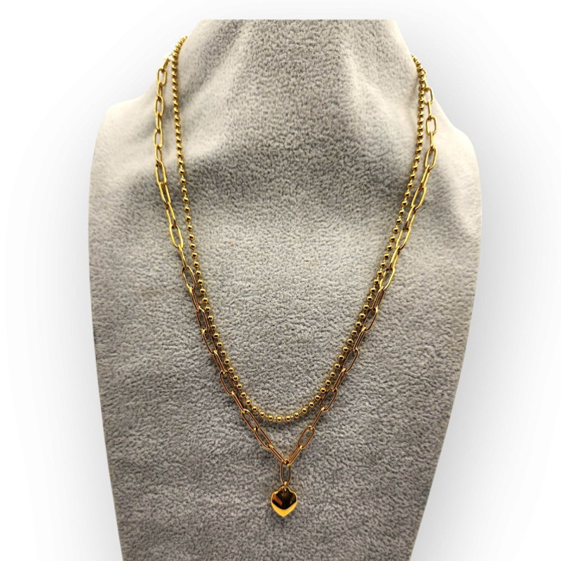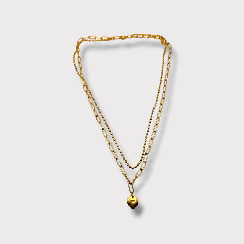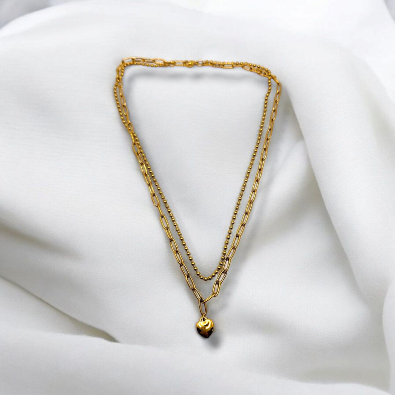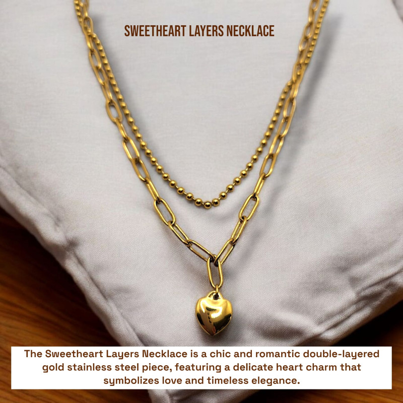 The Sweetheart Layers Necklace is a chic and romantic double-layered gold stainless steel piece, featuring a delicate heart charm that symbolizes love and timeless elegance.