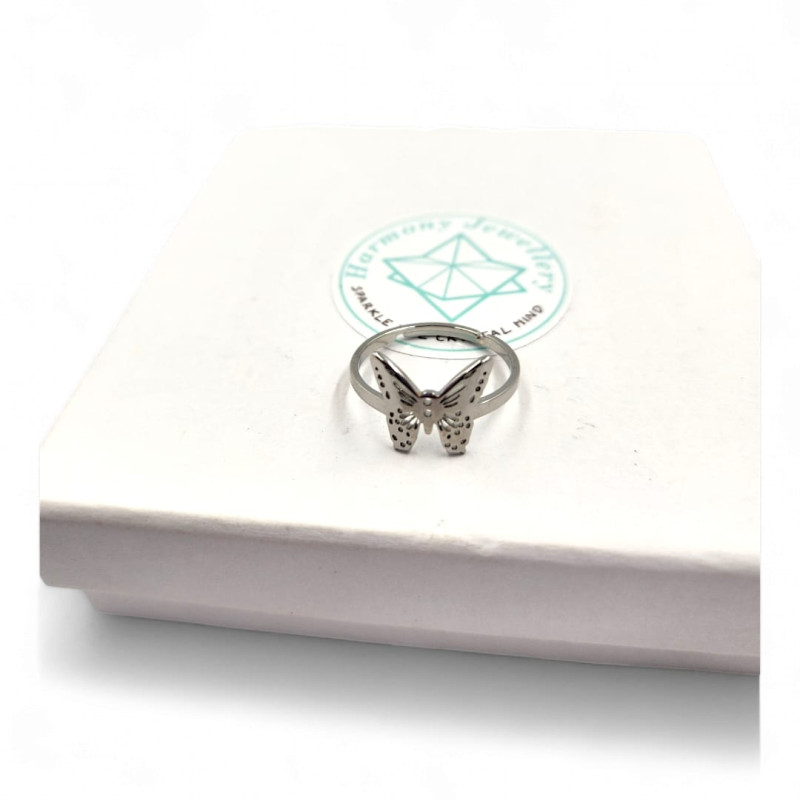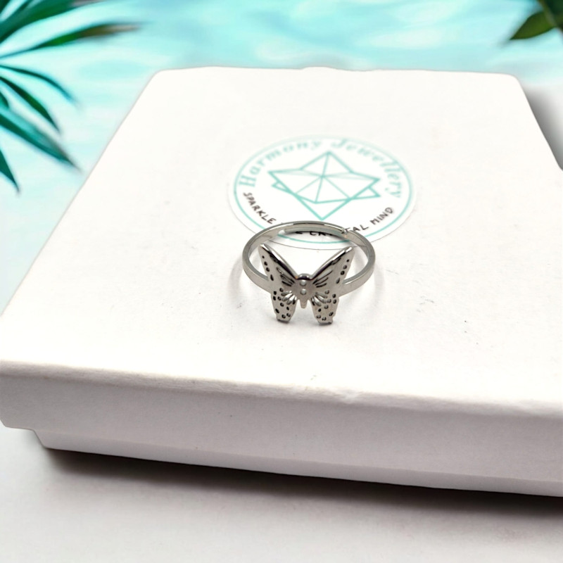 This charming butterfly ring, crafted from durable stainless steel in a sleek silver tone, brings a touch of nature-inspired elegance to any look.