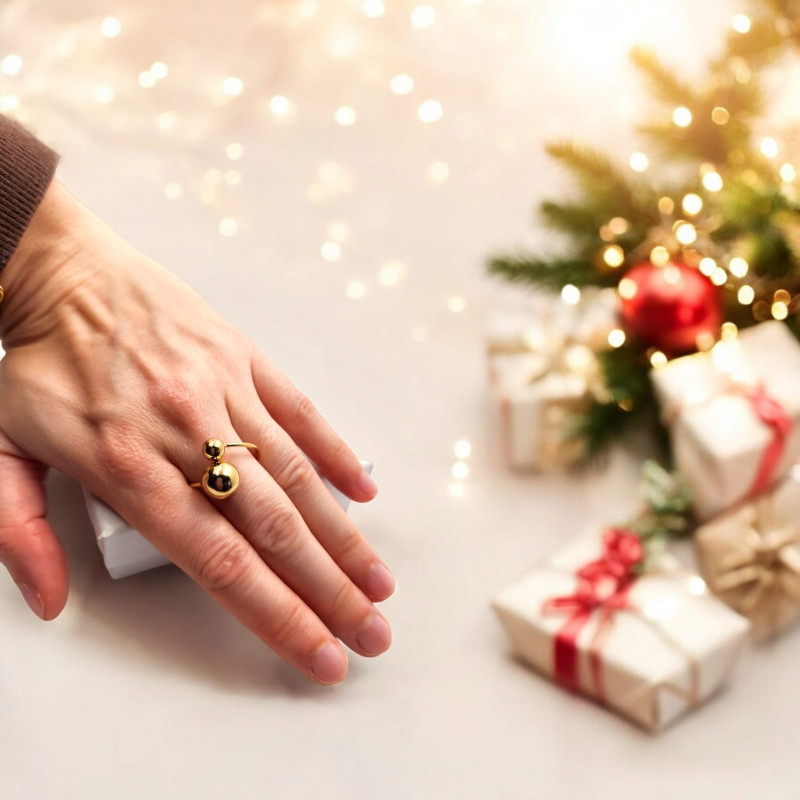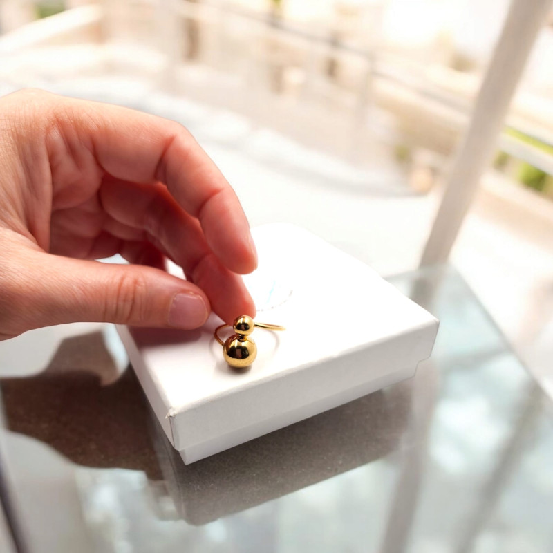 It features two polished spheres—one larger and one smaller—balanced elegantly on an open band. Adjustable to fit a variety of sizes, including size 8, it can easily be worn on different fingers for a versatile look.
