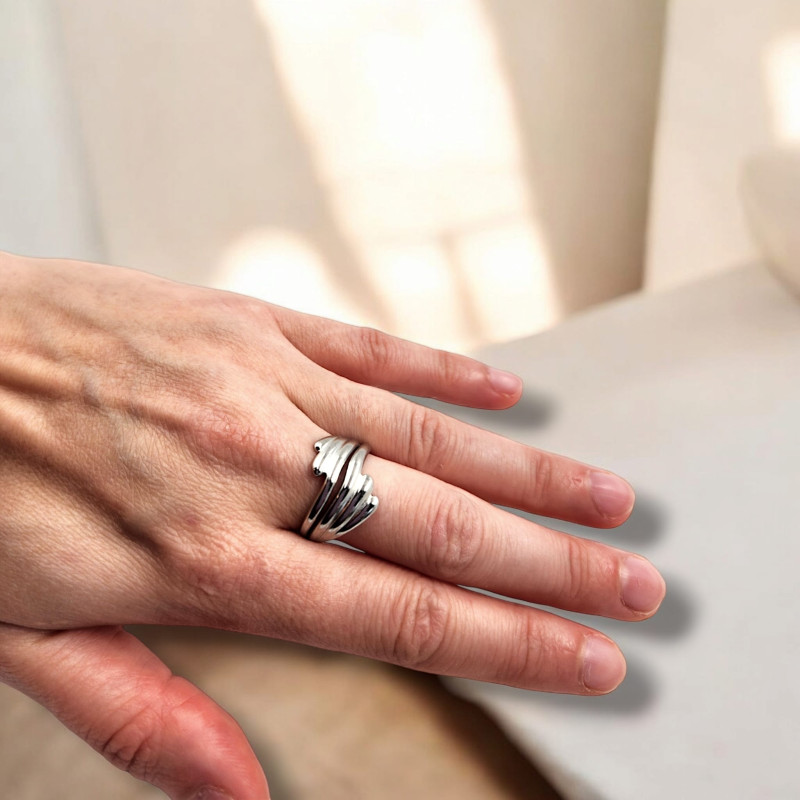 This stainless steel ring features a unique wraparound design in a sleek silver-tone finish.